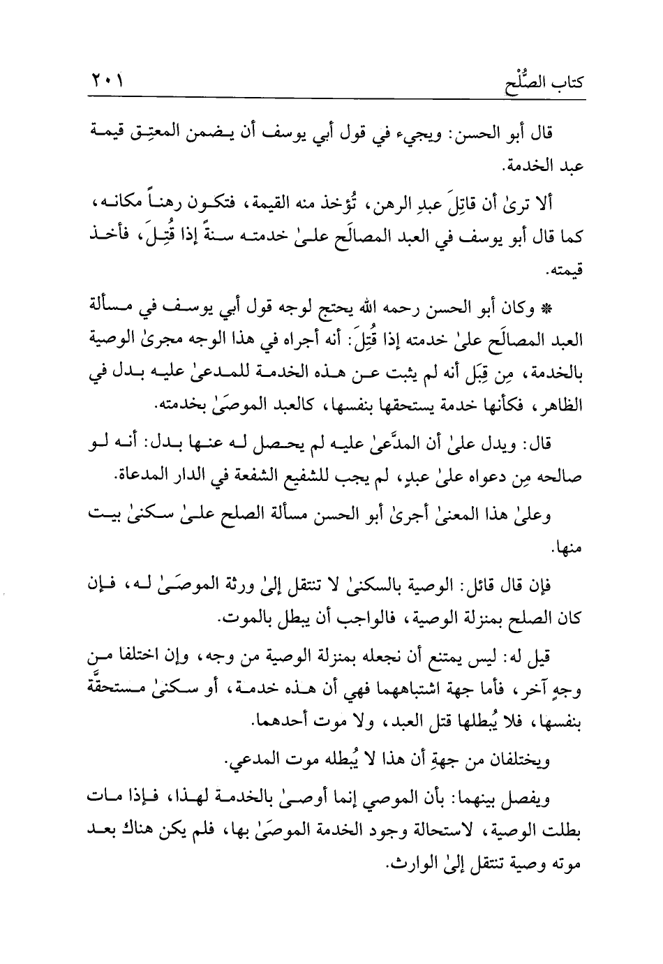 *وكان أبو الحسن رحمه الله يحتج قول أبي يوسف في مسألة العبد المصالح على خدمته إذا قتل: أنه أجراه في هذا الوجه مجرى الوصية بالخدمة، من قبل أنه لم يثبت عن هذه الخدمة للمدعى عليه بدل في الظاهر، فكأنها خدمة يستحقها بنفسها، كالعبد الموصى بخدمته.