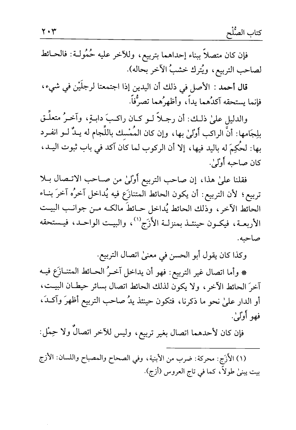 فقلنا على هذا، إن صاحب التربيع أولى من صاحب الاتصال بلا تربيع؛ لأن التربيع: أن يكون الحائط المتنازع فيه يداخل آخره آخر بناء الحائط الآخر، وذلك الحائط يداخل مالكه من جوانب البيت الأربعة، فيكون حينئذ بمنزلة الأزج، والبيت واحد، فيستحقه صاحبه.