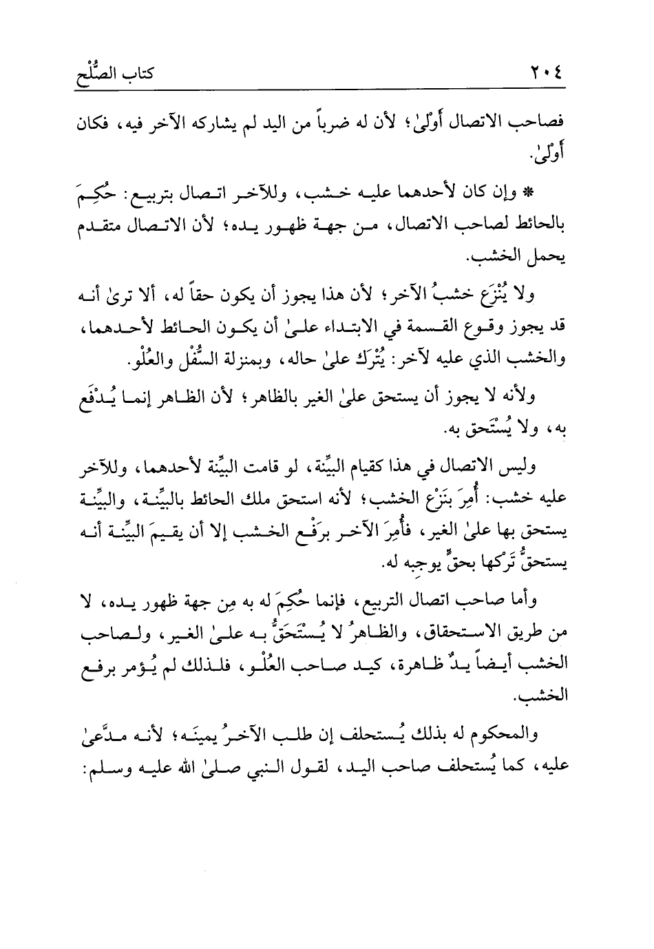 وأما صاحب اتصال التربيع، فإنما حكم له به من جهة ظهور يده، لا من طريق الاستحقاق، والظاهر لا يستحق به على الغير، ولصاحب الخشب أيضا يد ظاهرة، كيد صاحب العلو، فلذلك لم يؤمر برفع الخشب.