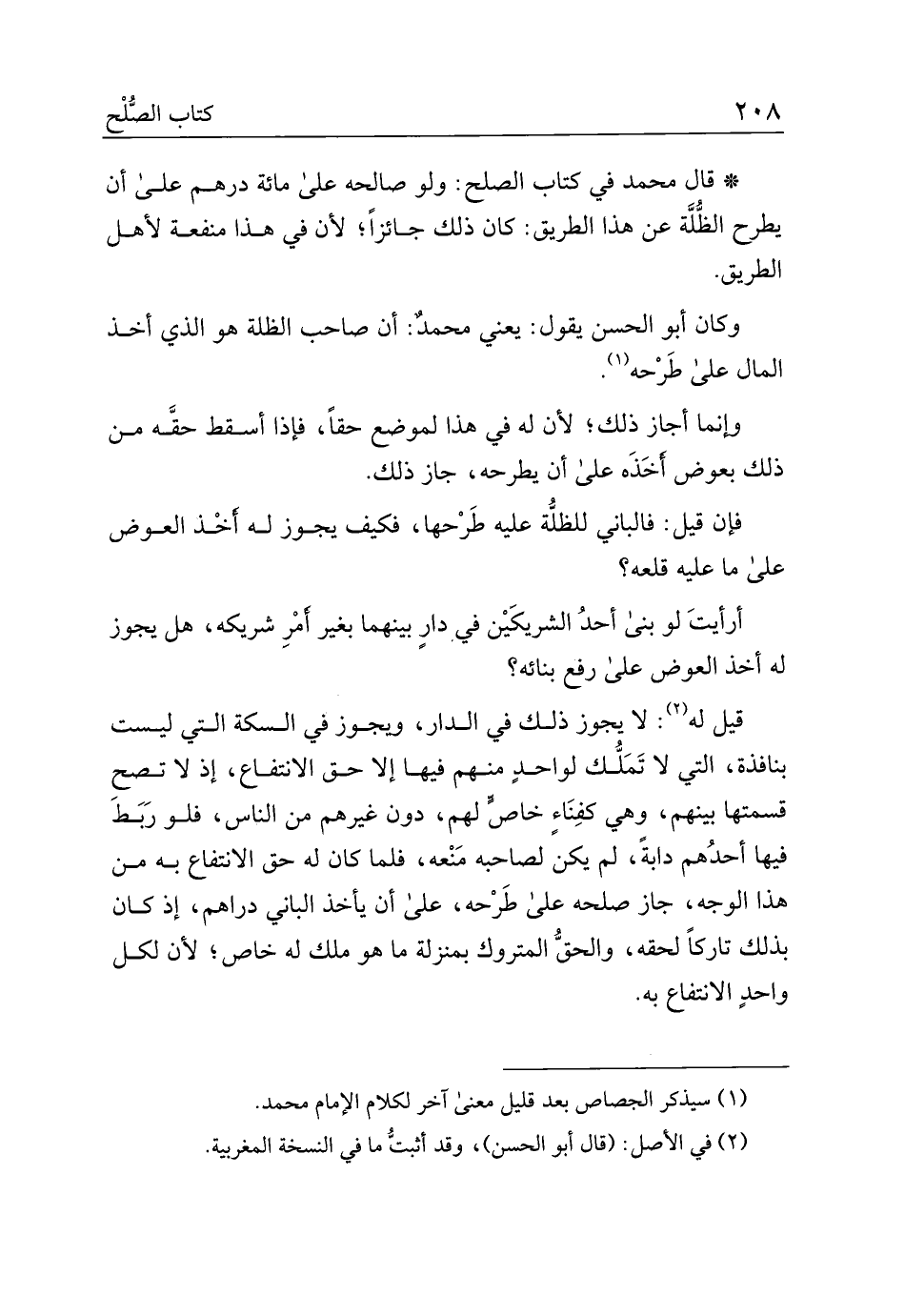 قيل له: لا يجوز ذلك في الدار، ويجوز في السكة التي ليست بنافذة، التي لا تملك لواحد منهم فيها إلا حق الانتفاع، إذ لا تصح قسمتها بينهم، وهي كفناء خاص لهم، دون غيرهم من الناس، فلو ربط فيها أحدهم دابة، لم يكن لصاحبة منعه، فلما كان له حق الانتفاع به من هذا الوجه، جاز صلحه على طرحه، على أن يأخذ الباني دراهم، إذ كان بذلك تاركا لحقه، والحق المتروك بمنزلة ما هو ملك له خاص؛ لأن لكل واحد الانتفاع به.