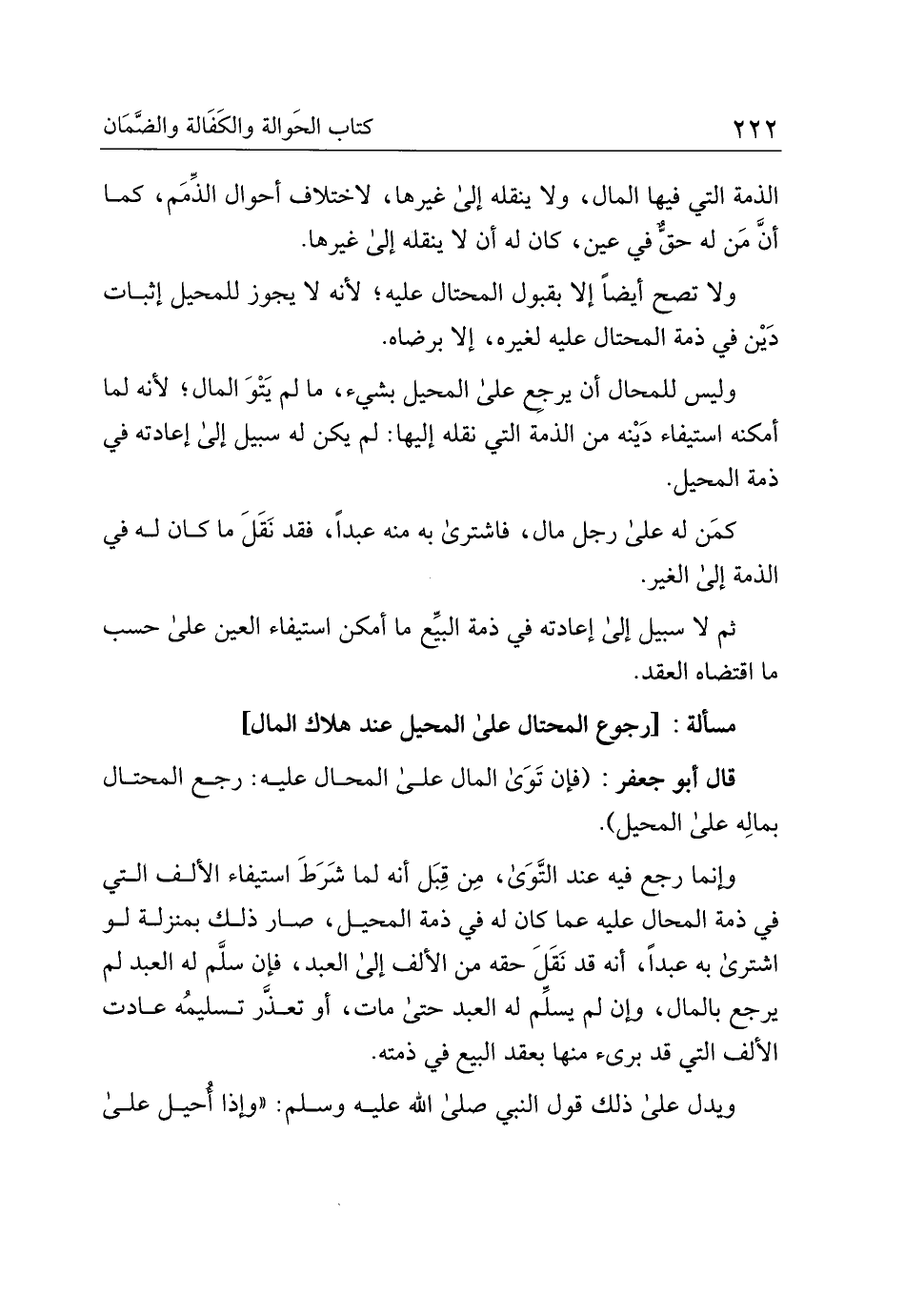 وليس للمحال أن يرجع على المحيل بشيء، ما لم يتو المال؛ لأنه لما أمكنه استيفاء دينه من الذمة الني نقلها إليها: لم يكن له سبيل إلى إعادته في ذمة المحيل.