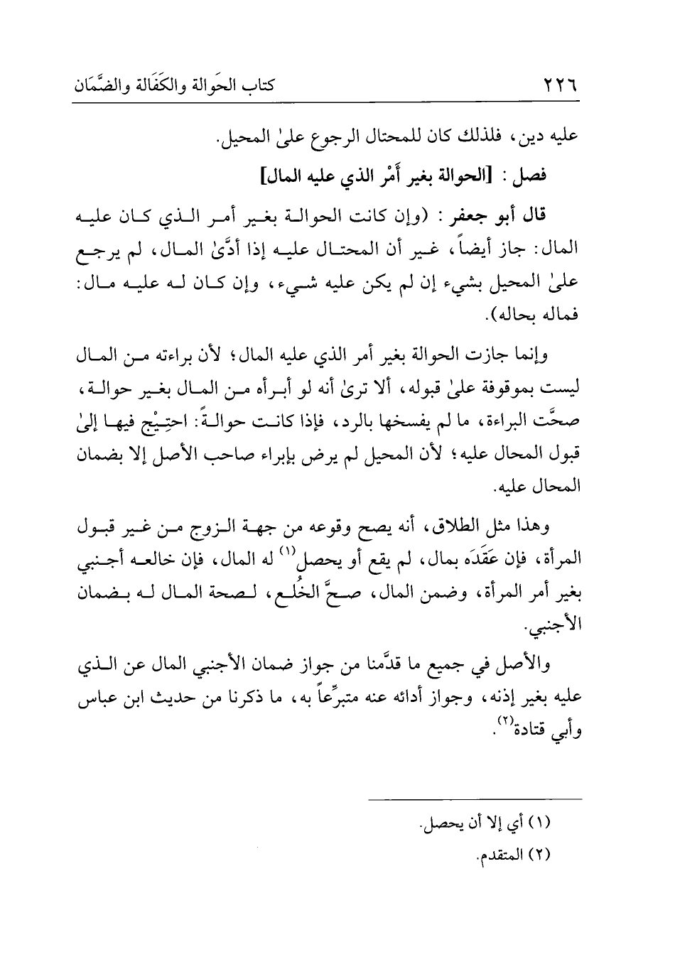 قال أبو جعفر: (وإن كانت الحوالة بغير أمر الذي كان عليه المال: جاز أيضا، غير أن المحتال عليه إذا أدى المال، لم يرجع على المحيل بشيء إن لم يكن عليه شيء، وإن كان له عليه مال: فماله بحاله).