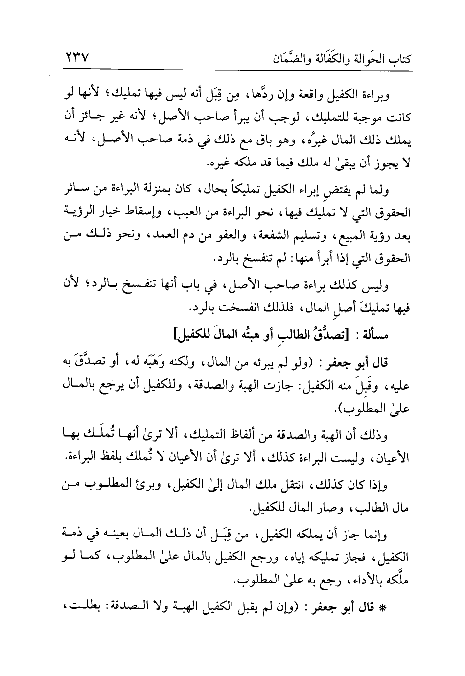 قال أبو جعفر: (ولو لم يبرئه من المال، ولكنه وهبه له، أو تصدق به عليه، وقبل منه الكفيل: جازت الهبة والصدقة، وللكفيل أن يرجع بالمال على المطلوب).