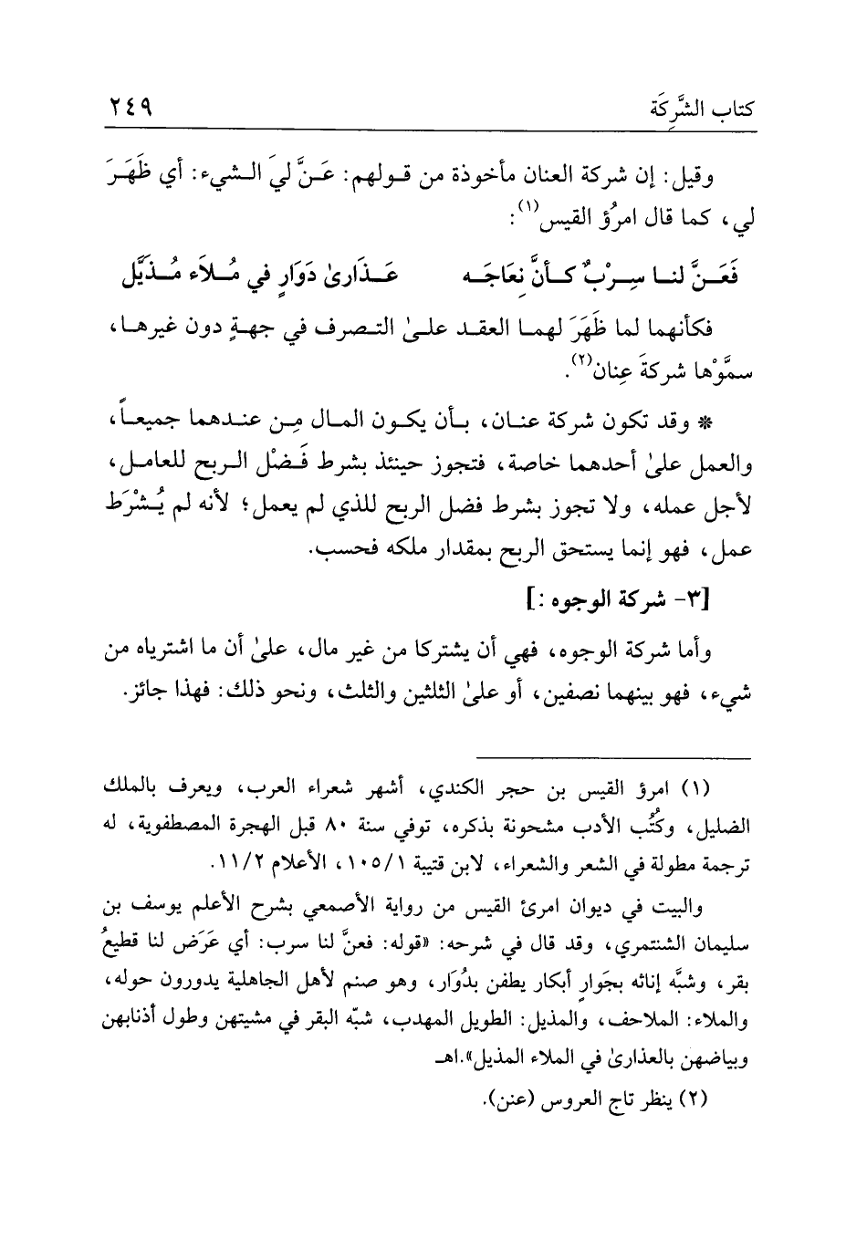 وقيل: إن شركة العنان مأخوذة من قولهم: عن لي الشيء: أي ظهر لي، كما قال امرؤ القيس: