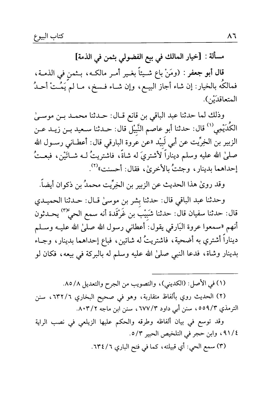وحدثنا عبد الباقي قال: حدثنا بشر بن موسى قال: حدثنا الحميدي قال: حدثنا سفيان قال: حدثنا شبيب بن غرقدة أنه سمع الحي يحدثون أنهم "سمعوا عروة البارقي يقول: أعطاني رسول الله صلى الله عليه وسلم دينارا أتري به أضحية، فاشتريت له شاتين، فباع أحداهما بدينار، وجاء بدينار وشاة، فدعا النبي صلى الله عليه وسلم له بالبركة في بيعه، فكان لو