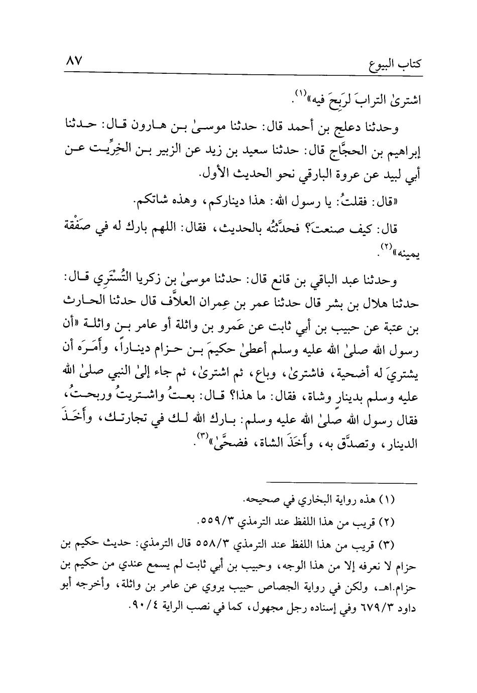 وحدثنا عبد الباقي بن قانع قال: حدثنا موسى بن زكريا التستري قال: حدثنا هلال بن بشر قال: حدثنا عمر بن عمران العلاف قال: حدقنا الحارث بن عتبة عن حبيب بن أبي ثابت عن عمرو بن واثلة أو عامر بن واثلة "أن رسول الله صلى الله عليه وسلم أعطى حكيم بن حزام دينارا، وأمره أن يشتري له أضحية، فاشترى، وباع، ثم اشترى، ثم جاء إلى النبي صلى الله عليه وسلم بدينار وشاة، فقال: ما هذا؟ قال: بعت واشتريت وربحت، فقال رسول الله صلى الله عليه وسلم: بارك الله لك في تجارتك، وأخذ الدينار، وتصدق به، وأخذ الشاة، فضحى".