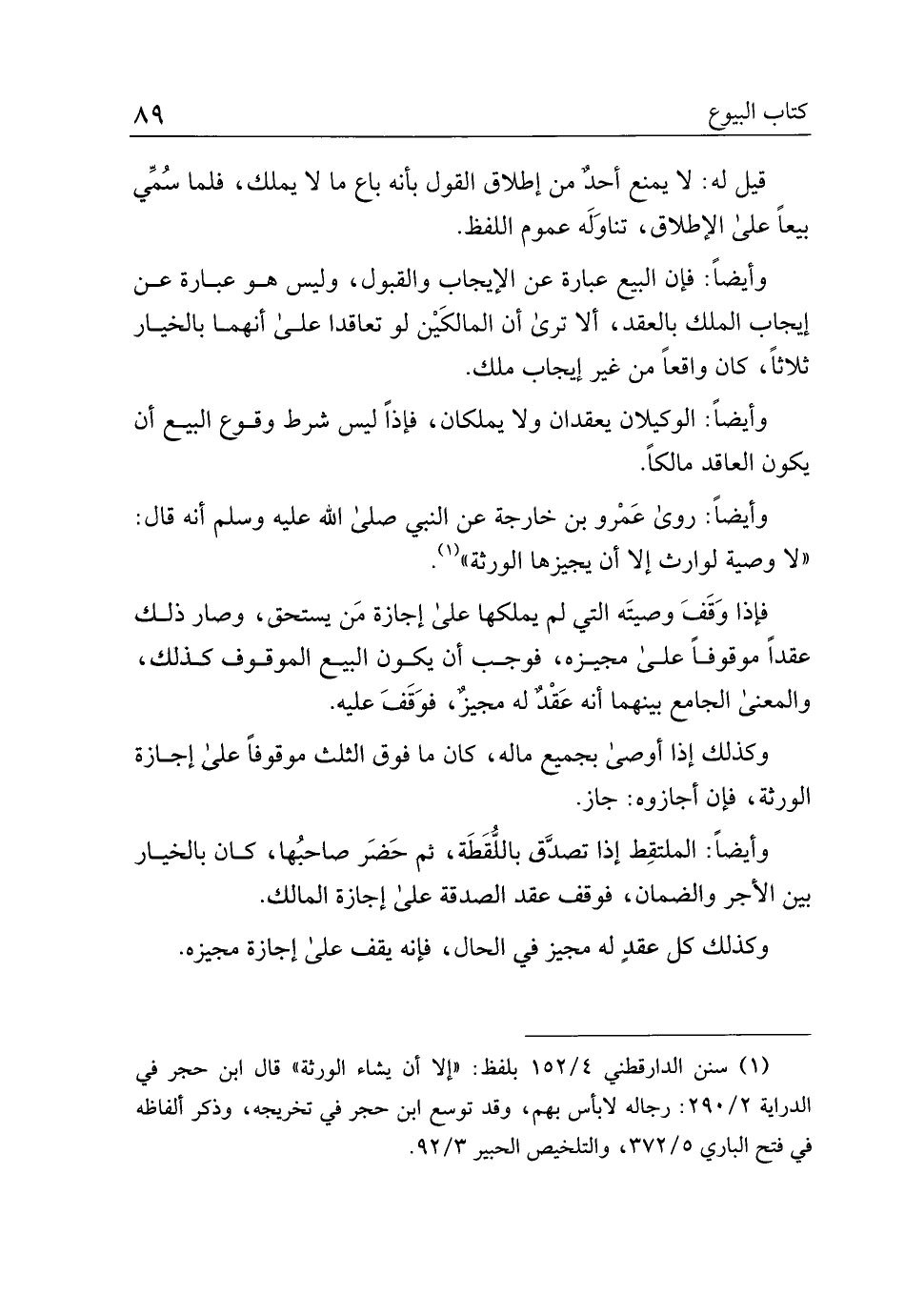 وأيضا: فإن البيع عبارة عن الإيجاب والقبول، وليس هو عبارة عن إيجاب الملك بالعقد، ألا ترى أن المالكين لو تعاقدا على أنهما بالخيار ثلاثا، كان واقعا من غير إيجاب ملك.