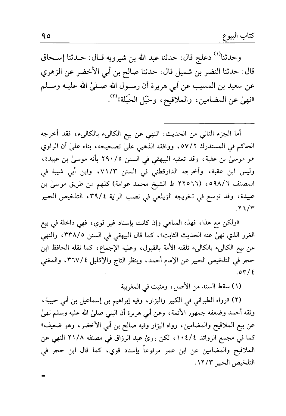 وحدثنا دعلج قال: حدثنا عبد الله بن شيرويه قال: حدثنا إسحاق قال: حدثنا النضر بن شميل قال: حدثنا صالح بن أبي الأخضر عن الزهري عن سعيد بن المسيب عن أبي هريرة أن رسول الله صلى الله عليه وسلم "نهى عن المضامين، والملاقيح، وحبل الحبلة".