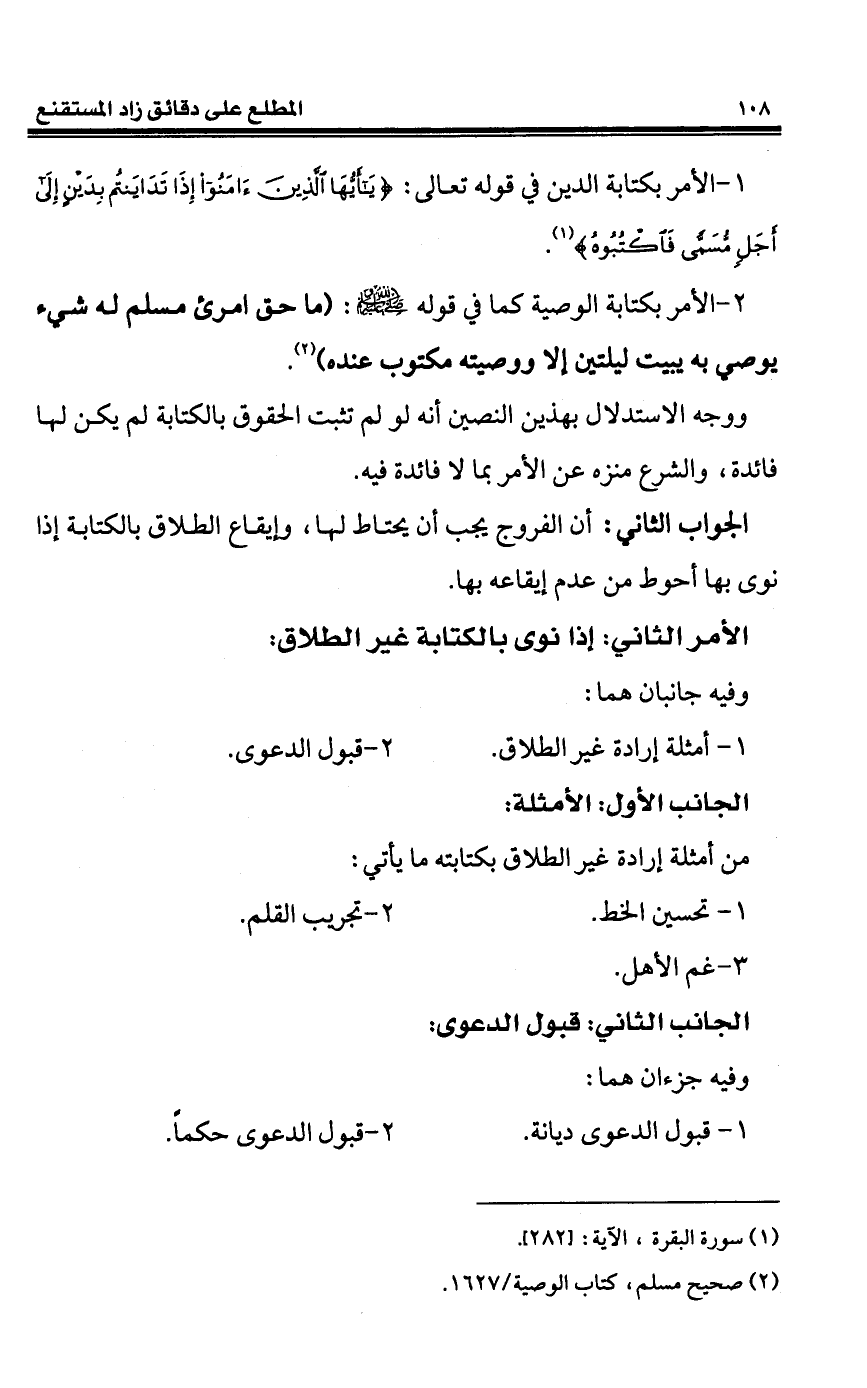 2 - الأمر بكتابة الوصية كما في قوله - صلى الله عليه وسلم -: (ما حق امرئ مسلم له شيء يوصي به يبيت ليلتين إلا ووصيته مكتوب عنده) (¬2).