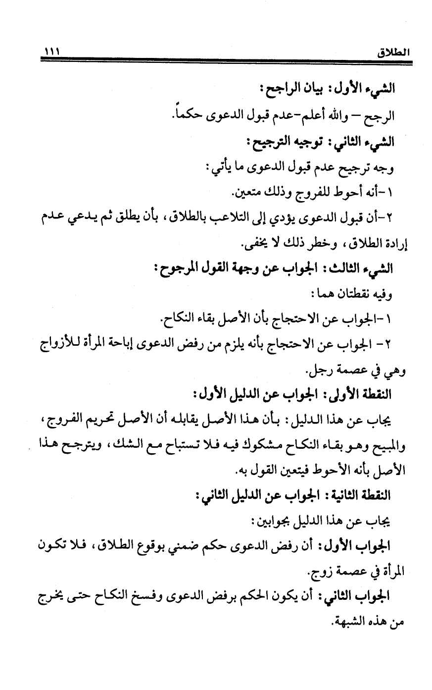 يجاب عن هذا الدليل: بأن هذا الأصل يقابله أن الأصل تحريم الفروج، والمبيح وهو بقاء النكاح مشكوك فيه فلا تستباح مع الشك، ويترجح هذا الأصل بأنه الأحوط فيتعين القول به.