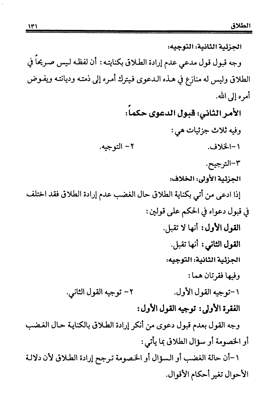 إذا ادعى من أتي بكناية الطلاق حال الغضب عدم إرادة الطلاق فقد اختلف في قبول دعواه في الحكم على قولين: