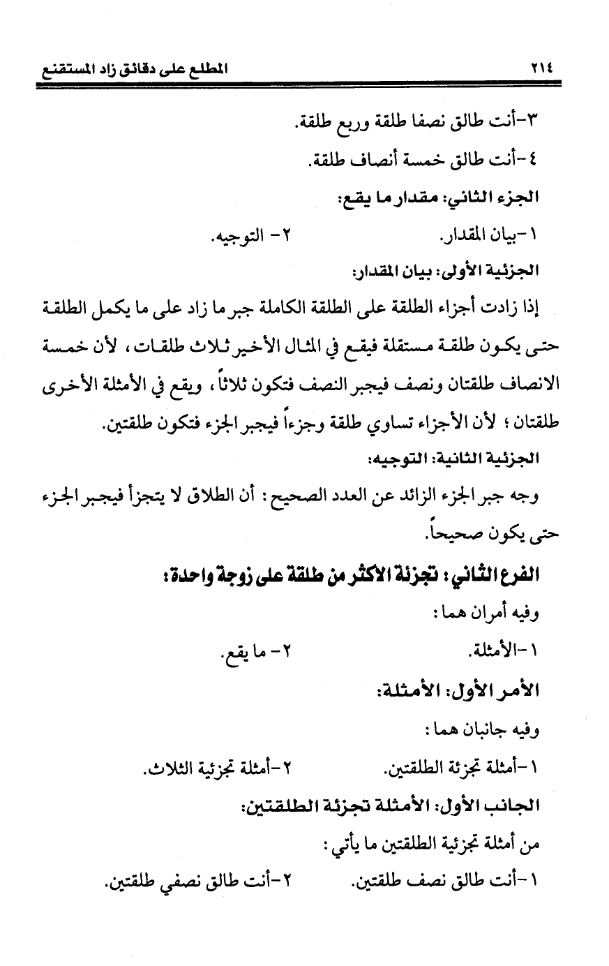 إذا زادت أجزاء الطلقة على الطلقة الكاملة جبر ما زاد على ما يكمل الطلقة حتى يكون طلقة مستقلة فيقع في المثال الأخير ثلاث طلقات؛ لأن خمسة الانصاف طلقتان ونصف فيجبر النصف فتكون ثلاثًا، ويقع في الأمثلة الأخرى طلقتان؛ لأن الأجزاء تساوي طلقة وجزءًا فيجبر الجزء فتكون طلقتين.