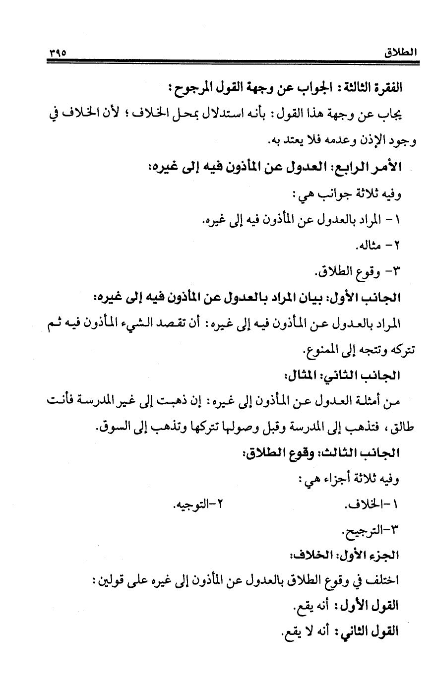 من أمثلة العدول عن المأذون إلى غيره: إن ذهبت إلى غير المدرسة فأنت طالق، فتذهب إلى المدرسة وقبل وصولها تتركها وتذهب إلى السوق.
