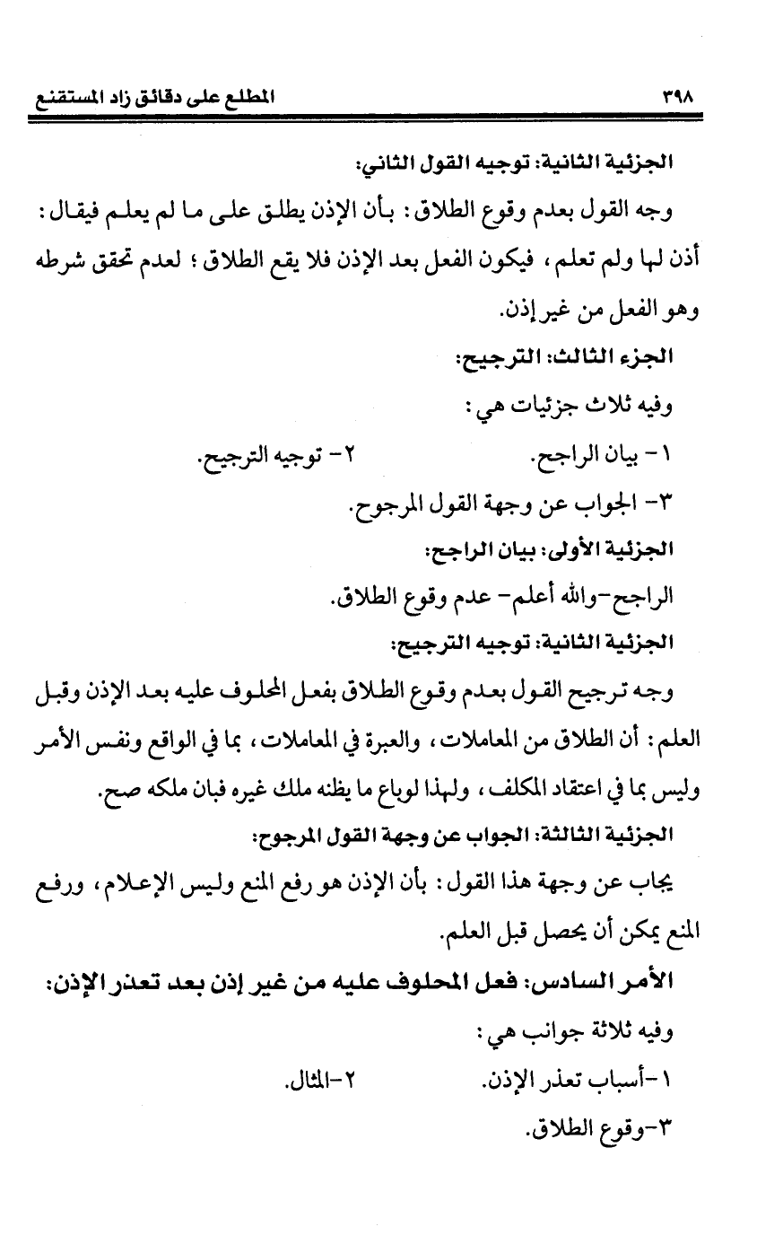 وجه ترجيح القول بعدم وقوع الطلاق بفعل المحلوف عليه بعد الإذن وقبل العلم: أن الطلاق من المعاملات، والعبرة في العاملات، بما في الواقع ونفس الأمر وليس بما في اعتقاد المكلف، ولهذا لو باع ما يظنه ملك غيره فبان ملكه صح.