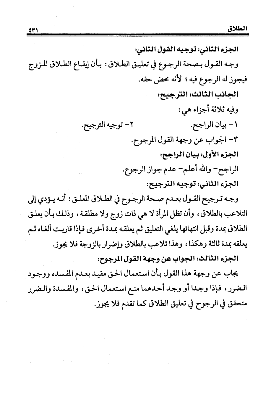 يجاب عن وجهة هذا القول بأن استعمال الحق مقيد بعدم المفسده ووجود الضرر، فإذا وجدا أو وجد أحدهما منع استعمال الحق، والمفسدة والضرر متحقق في الرجوح في تعليق الطلاق كما تقدم فلا يجوز.
