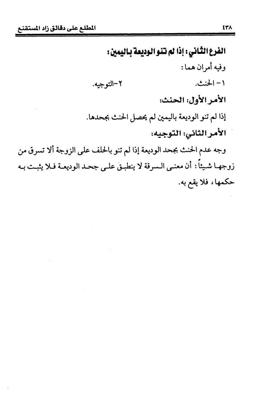 وجه عدم الحنث بجحد الوديعة إذا لم تنو بالحلف على الزوجة ألا تسرق من زوجها شيئاً: أن معنى السرقة لا ينطبق على جحد الوديعة فلا يثبت به حكمها، فلا يقع به.