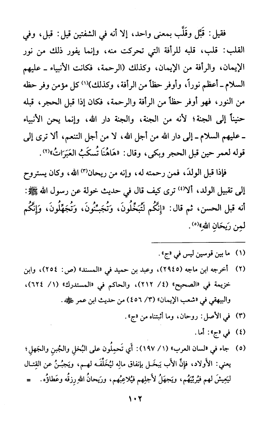 فقيل: قبل وقلب بمعنى واحد، إلا أنه في الشفتين قيل: قبل، وفي القلب: قلب، قلبه للرأفة التي تحركت منه، وإنما يفور ذلك من نور الإيمان، والرأفة من الإيمان، وكذلك (الرحمة، فكانت الأنبياء -عليهم السلام- أعظم نوراً، وأوفر حظاً من الرأفة، وكذلك) كل مؤمن وفر حظه من النور، فهو أوفر حظاً من الرأفة والرحمة، فكان إذا قبل الحجر، قبله حنيناً إلى الجنة؛ لأنه من الجنة، والجنة دار الله، وإنما يحن بالأنبياء -عليهم السلام- إلى دار الله من أجل الله، لا من أجل التنعيم، ألا ترى إلى قوله لعمر حين قبل الحجر وبكى، وقال: ((هاهنا تسكب العبرات)).