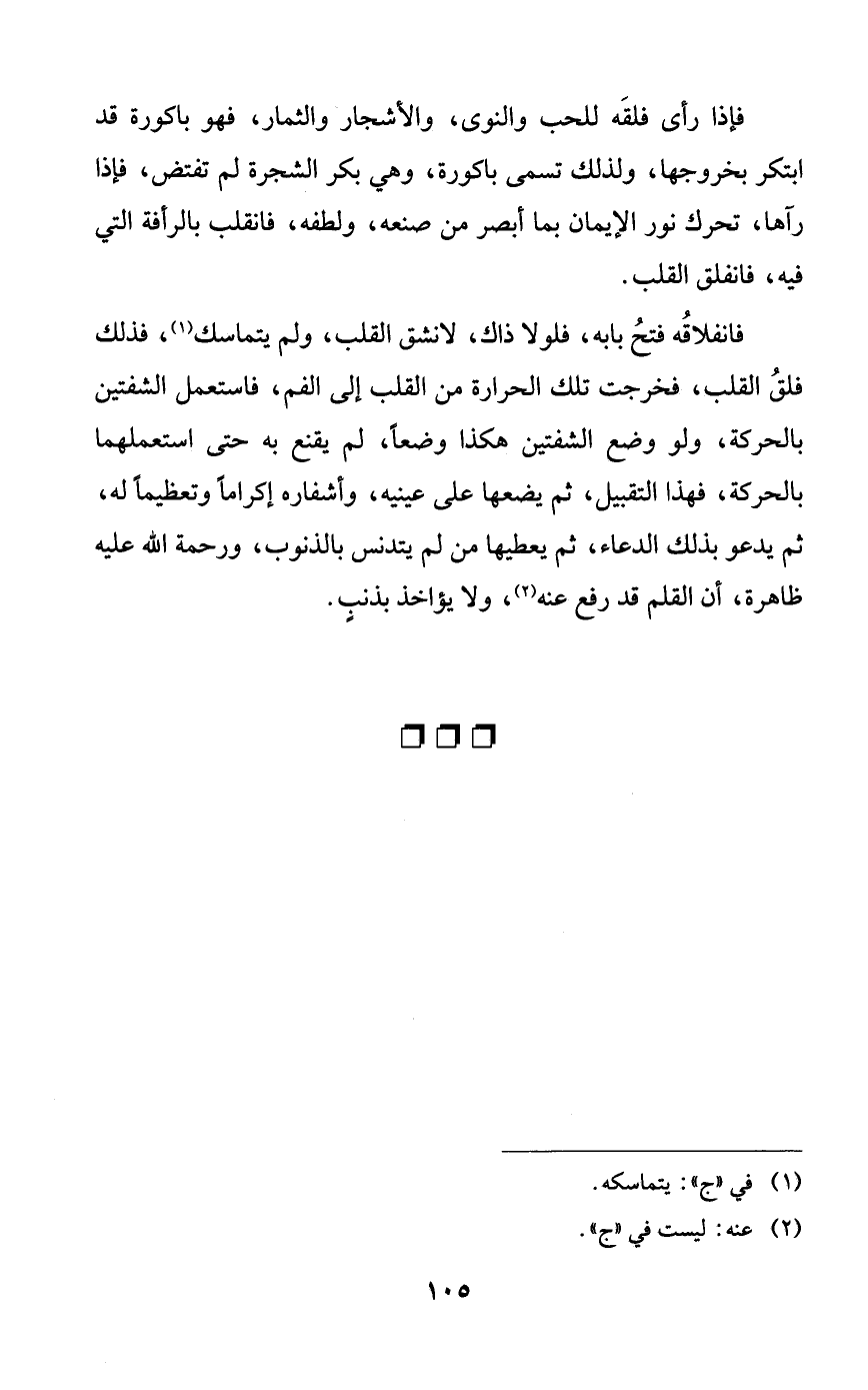 فإذا رأى فلقه للحب والنوى، والأشجار والثمار، فهو باكورة قد ابتكر بخروجها، ولذلك تسمى باكورة، وهي بكر الشجرة لم تفتض، فإذا رآها، تحرك نور الإيمان بما أبصر من صنعه، ولطفه، فانقلب بالرأفة التي فيه، فانفلق القلب.