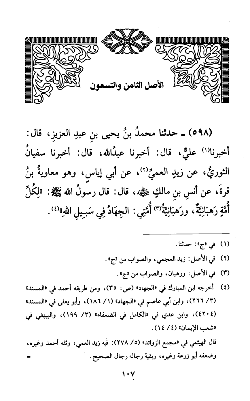 598 - حدثنا محمد بن يحيى بن عبد العزيز، قال: أخبرنا عليٌّ، قال: أخبرنا عبد الله، قال: أخبرنا سفيان الثوري، عن زيدٍ العمي، عن أبي إياسٍ، وهو معاوية بن قرة، عن أنس بن مالكٍ رضي الله عنه، قال: قال رسول الله صلى الله عليه وسلم: ((لكل أمةٍ رهبانيةٌ، ورهبانية أمتي: الجهاد في سبيل الله)).