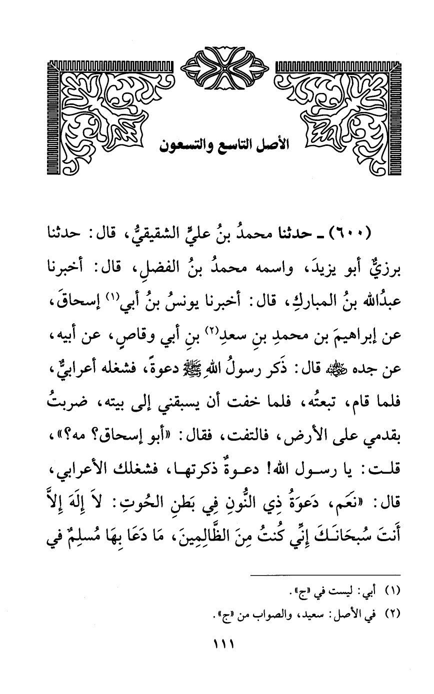 600 - حدثنا محمد بن علي الشقيقي، قال: حدثنا برزيٌّ أبو يزيد، واسمه محمد بن الفضل، قال: أخبرنا عبد الله بن المبارك، قال: أخبرنا يونس بن أبي إسحاق، عن إبراهيم بن محمد بن سعد بن أبي وقاصٍ، عن أبيه، عن جده رضي الله عنه قال: ذكر رسول الله صلى الله عليه وسلم دعوةً، فشغله أعرابيٌّ، فلما قام، تبعته، فلما خفت أن يسبقني إلى بيته، ضربت بقدمي على الأرض، فالتفت، فقال: ((أبو إسحاق؟ مه؟))، قلت: يا رسول الله! دعوةٌ ذكرتها، فشغلك الأعرابي، قال: ((نعم، دعوة ذي النون في بطن الحوت، لا إله إلا أنت سبحانك إني كنت من الظالمين، ما دعا بها مسلمٌ في