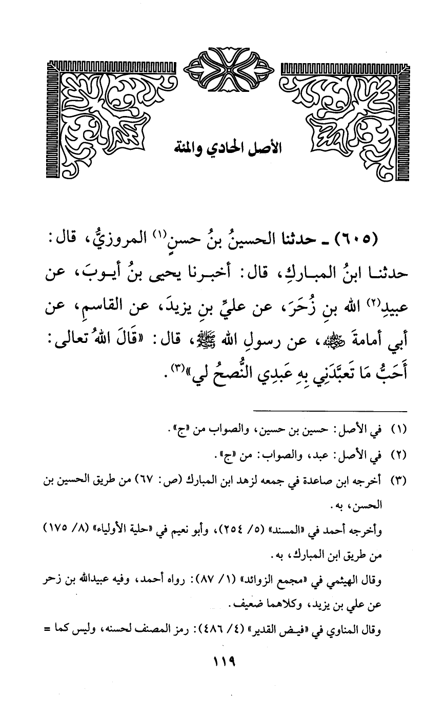 605 - حدثنا الحسين بن حسنٍ المروزي، قال: حدثنا ابن المبارك، قال: أخبرنا يحيى بن أيوب، عن عبيد الله بن زحر، عن علي بن يزيد، عن القاسم، عن أبي أمامة رضي الله عنه، عن رسول الله صلى الله عليه وسلم، قال: ((قال الله تعالى: أحب ما تعبدني به عبدي النصح لي)).