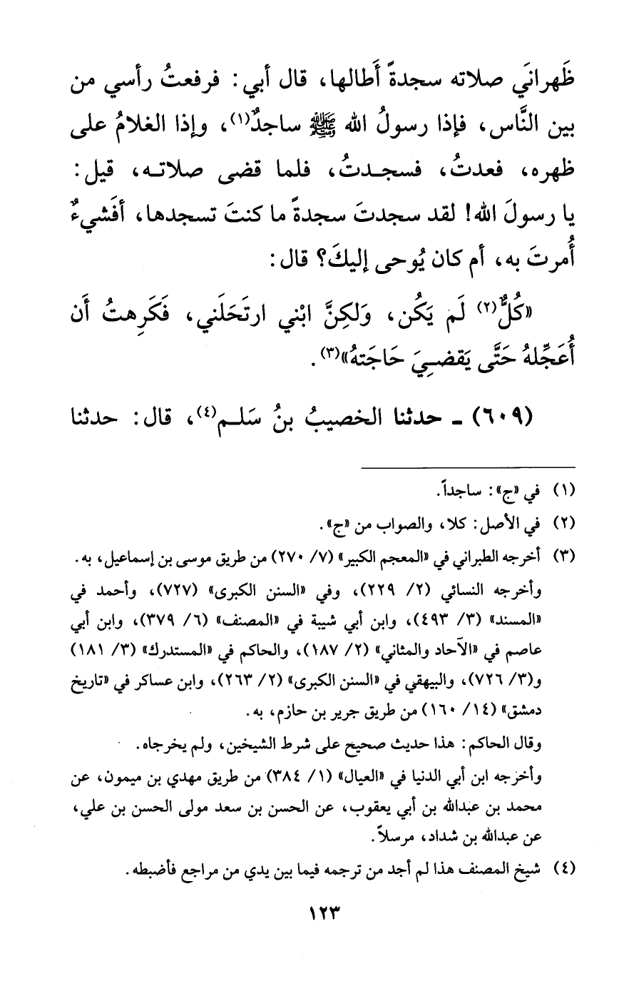 ظهراني صلاته سجدةً أطالها، قال أبي: فرفعت رأسي من بين الناس، فإذا رسول الله صلى الله عليه وسلم ساجدٌ، وإذا الغلام على ظهره، فعدت، فسجدت، فلما قضى صلاته، قيل: يا رسول الله! لقد سجدت سجدةً ما كنت تسجدها، أفشيءٌ أمرت به، أم كان يوحى إليك؟ قال: