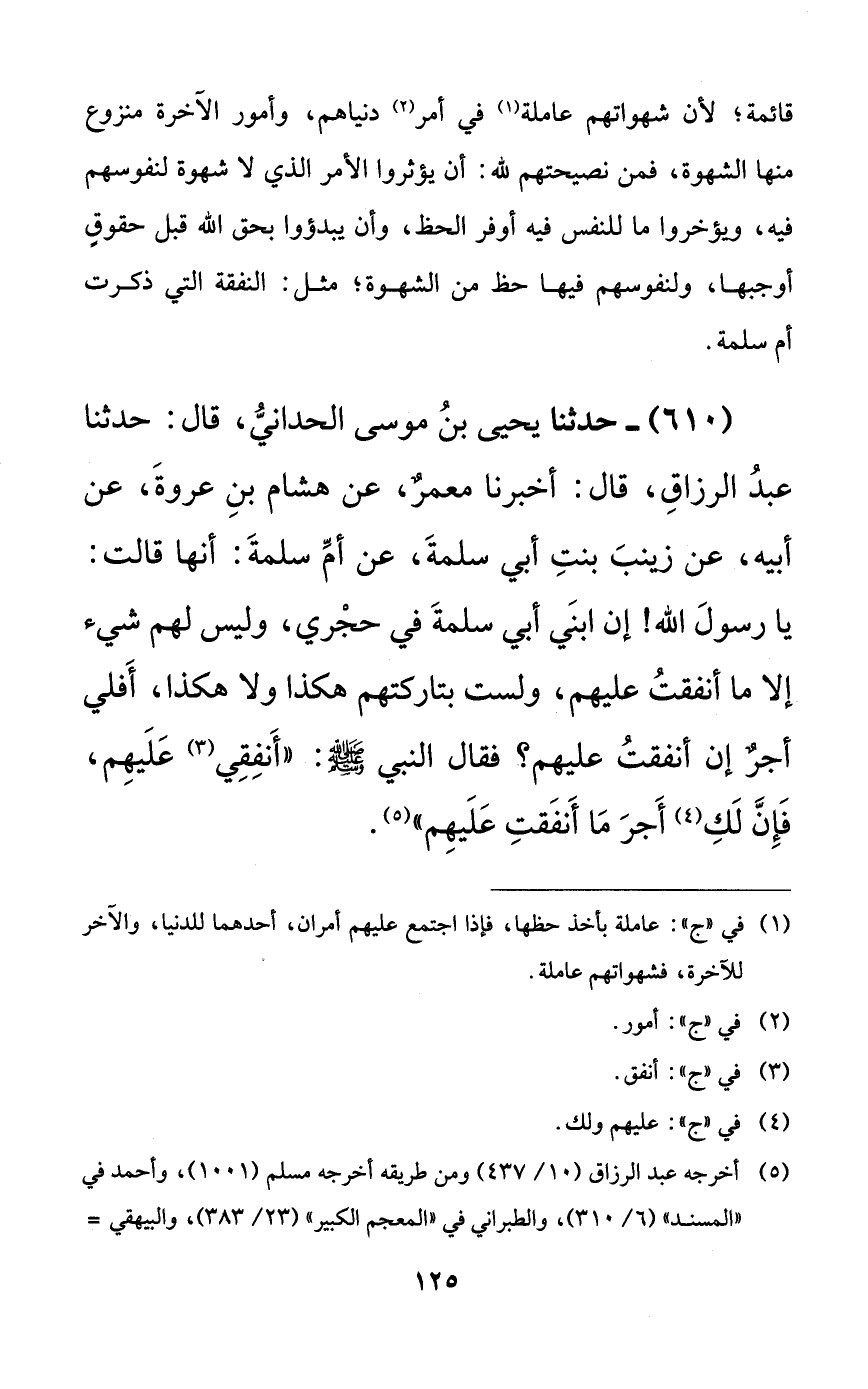 610 - حدثنا يحيى بن موسى الحداني، قال: حدثنا عبد الرزاق، قال: أخبرنا معمرٌ، عن هشام بن عروة، عن أبيه، عن زينب بنت أبي سلمة، عن أم سلمة: أنها قالت: يا رسول الله! إن ابني أبي سلمة في حجري، وليس لهم شيء إلا ما أنفقت عليهم، ولست بتاركتهم هكذا ولا هكذا، أفلي أجرٌ إن أنفقت عليهم؟ فقال النبي صلى الله عليه وسلم: ((أنفقي عليهم، فإن لك أجر ما أنفقت عليهم)).