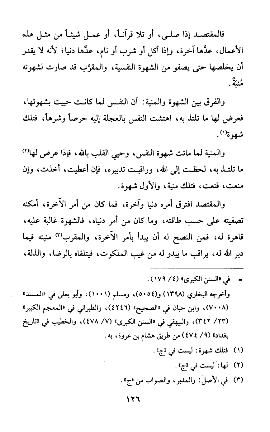 فالمقتصد إذا صلى، أو تلا قرآناً، أو عمل شيئاً من مثل هذه الأعمال، عدها آخرة، وإذا أكل أو شرب أو نام، عدها دنيا؛ لأنه لا يقدر أن يخلصها حتى يصفو من الشهوة النفسية، والمقرب قد صارت لشهوته منيةٌ.