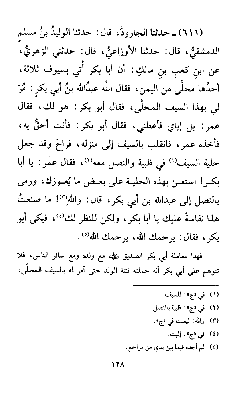 611 - حدثنا الجارود، قال: حدثنا الوليد بن مسلمٍ الدمشقي، قال: حدثنا الأوزاعي، قال: حدثني الزهري، عن ابن كعب بن مالكٍ: أن أبا بكر أتي بسيوف ثلاثة، أحدها محلى من اليمن، فقال ابنه عبد الله بن أبي بكرٍ: مر لي بهذا السيف المحلى، فقال أبو بكر: هو لك، فقال عمر: بل إياي فأعطني، فقال أبو بكر: فأنت أحق به، فأخذه عمر، فانقلب بالسيف إلى منزله، فراح وقد جعل حلية السيف في ظبية والنصل معه، فقال عمر: يا أبا بكر! استعن بهذه الحلية على بعض ما يعوزك، ورمى بالنصل إلى عبد الله بن أبي بكر، قال: والله! ما صنعت هذا نفاسةً عليك يا أبا بكر، ولكن للنظر لك، فبكى أبو بكر، فقال: يرحمك الله، يرحمك الله.