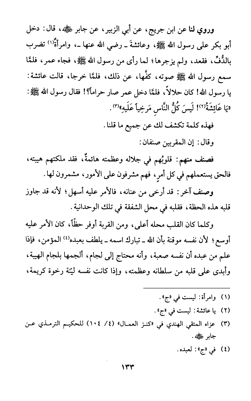 وروي لنا عن ابن جريج، عن أبي الزبير، عن جابر رضي الله عنه، قال: دخل أبو بكر على رسول الله صلى الله عليه وسلم، وعائشة -رضي الله عنها-، وامرأةٌ تضرب بالدف، فقعد، ولم يزجرها؛ لما رأى من رسول الله صلى الله عليه وسلم، فجاء عمر، فلما سمع رسول الله صلى الله عليه وسلم صوته، كفها، عن ذلك، فلما خرجا، قالت عائشة: يا رسول الله! كان حلالاً، فلما دخل عمر صار حراماً؟! فقال رسول الله صلى الله عليه وسلم: ((يا عائشة! ليس كل الناس مرخياً عليه)).
