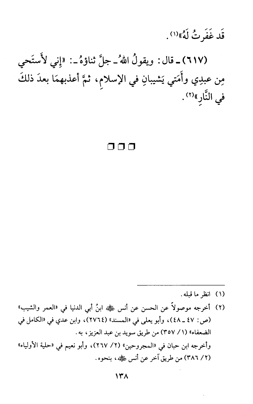 617 - قال: ويقول الله -جل ثناؤه-: ((إني لأستحي من عبدي وأمتي يشيبان في الإسلام، ثم أعذبهما بعد ذلك في النار)).