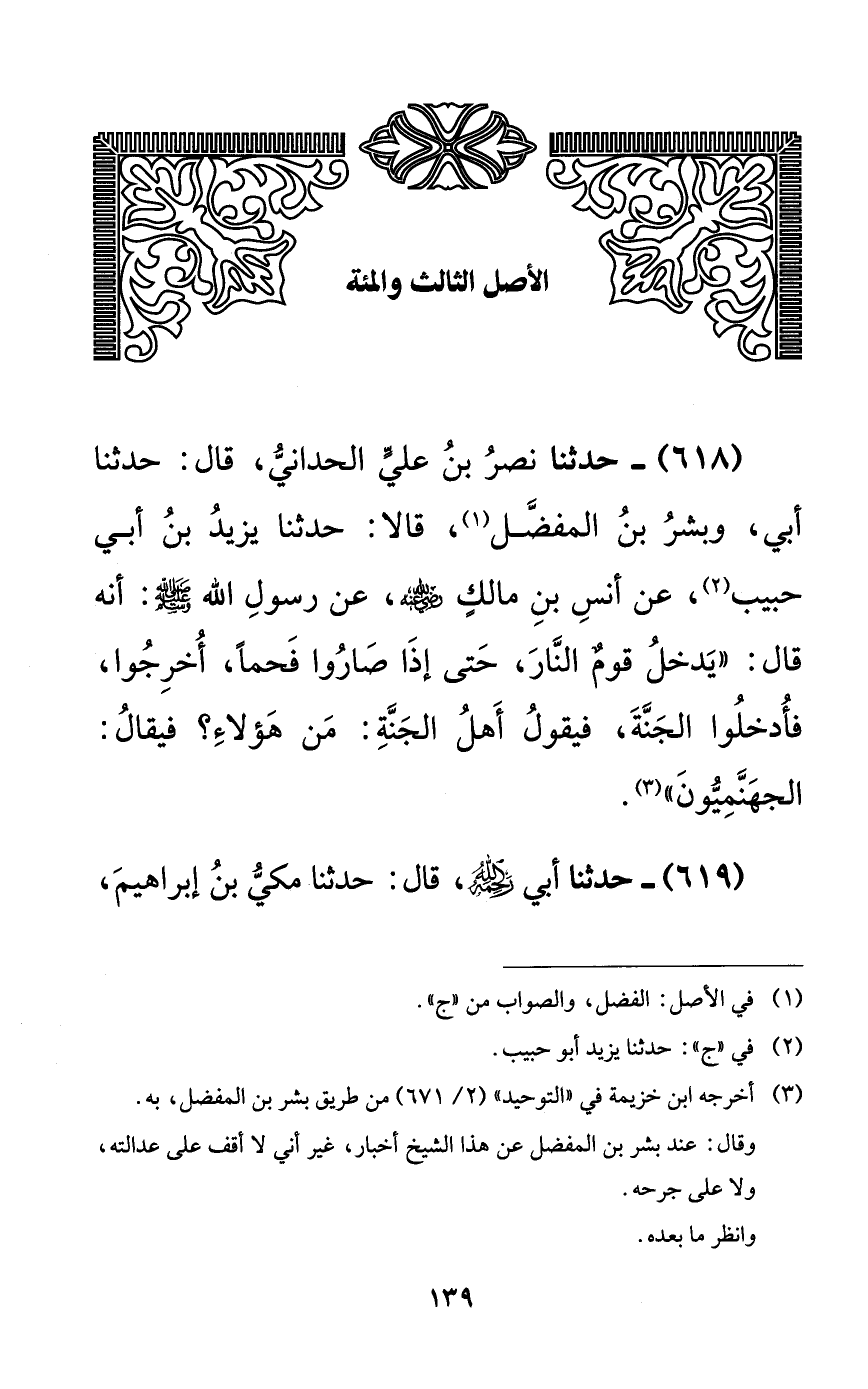 618 - حدثنا نصر بن عليٍّ الحداني، قال: حدثنا أبي، وبشر بن المفضل، قالا: حدثنا يزيد بن أبي حبيب، عن أنس بن مالكٍ رضي الله عنه، عن رسول الله صلى الله عليه وسلم: أنه قال: ((يدخل قومٌ النار، حتى إذا صاروا فحماً، أخرجوا، فأدخلوا الجنة، فيقول أهل الجنة: من هؤلاء؟ فيقال: الجهنميون)).