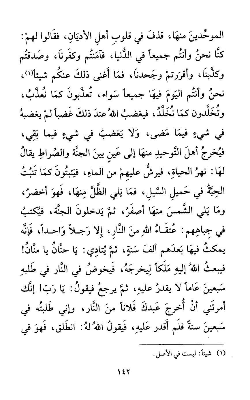 الموحدين منها، قذف في قلوب أهل الأديان، فقالوا لهم: كنا نحن وأنتم جميعاً في الدنيا، فآمنتم وكفرنا، وصدقتم وكذبنا، وأقررتم وجحدنا، فما أغنى ذلك عنكم شيئاً، نحن وأنتم اليوم فيها جميعاً سواء، تعذبون كما نعذب، وتخلدون كما نخلد، فيغضب الله عند ذلك غضباً لم يغضبه في شيء فيما مضى، ولا يغضب في شيءٍ فيما بقي، فيخرج أهل التوحيد منها إلى عينٍ بين الجنة والصراط يقال لها: نهر الحياة، فيرش عليهم من الماء، فينبتون كما تنبت الحبة من حميل السيل، فما يلي الظل منها، فهو أخضر، وما يلي الشمس منها فهو أصفر، ثم يدخلون الجنة، فيكتب في جباههم: عتقاء الله من النار، إلا رجلاً واحداً، فإنه يمكث فيما بعدهم ألف سنةٍ، ثم ينادي: يا حنان يا منان! فيبعث الله إليه ملكاً ليخرجه، فيخوض في النار في طلبه سبعين عاماً لا يقدر عليه، ثم يرجع فيقول: يا رب! إنك أمرتني أن أخرج عبدك فلاناً من النار، وإني طلبته في سبعين سنةً فلم أقدر عليه، فيقول الله له: انطلق، فهو في