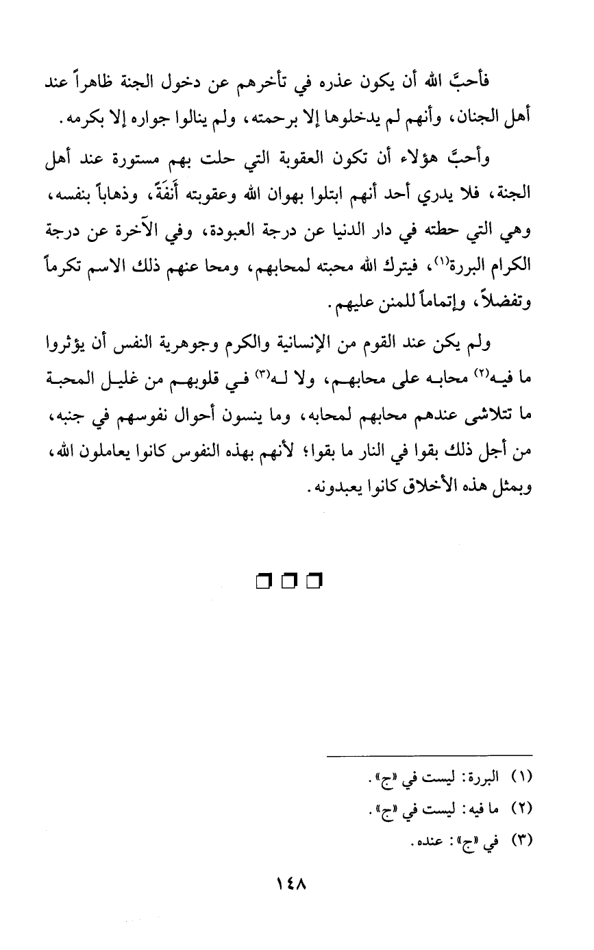 ولم يكن عند القوم من الإنسانية والكرم وجوهرية النفس أن يؤثروا ما فيه محابه على محابهم، ولا له في قلوبهم من غليل المحبة ما تتلاشى عندهم محابهم لمحابه، وما ينسون أحوال نفوسهم في جنبه، من أجل ذلك بقوا في النار ما بقوا؛ لأنهم بهذه النفوس كانوا يعاملون الله، وبمثل هذه الأخلاق كانوا يعبدونه.