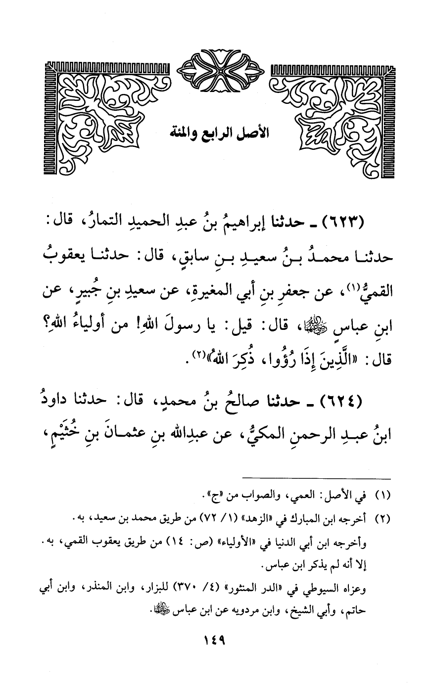 623 - حدثنا إبراهيم بن عبد الحميد التمار، قال: حدثنا محمد بن سعيد بن سابقٍ، قال: حدثنا يعقوب القمي، عن جعفر بن أبي المغيرة، عن سعيد بن جبيرٍ، عن ابن عباسٍ رضي الله عنهما، قال: قيل: يا رسول الله! من أولياء الله؟ قال: ((الذين إذا رؤوا، ذكر الله)).