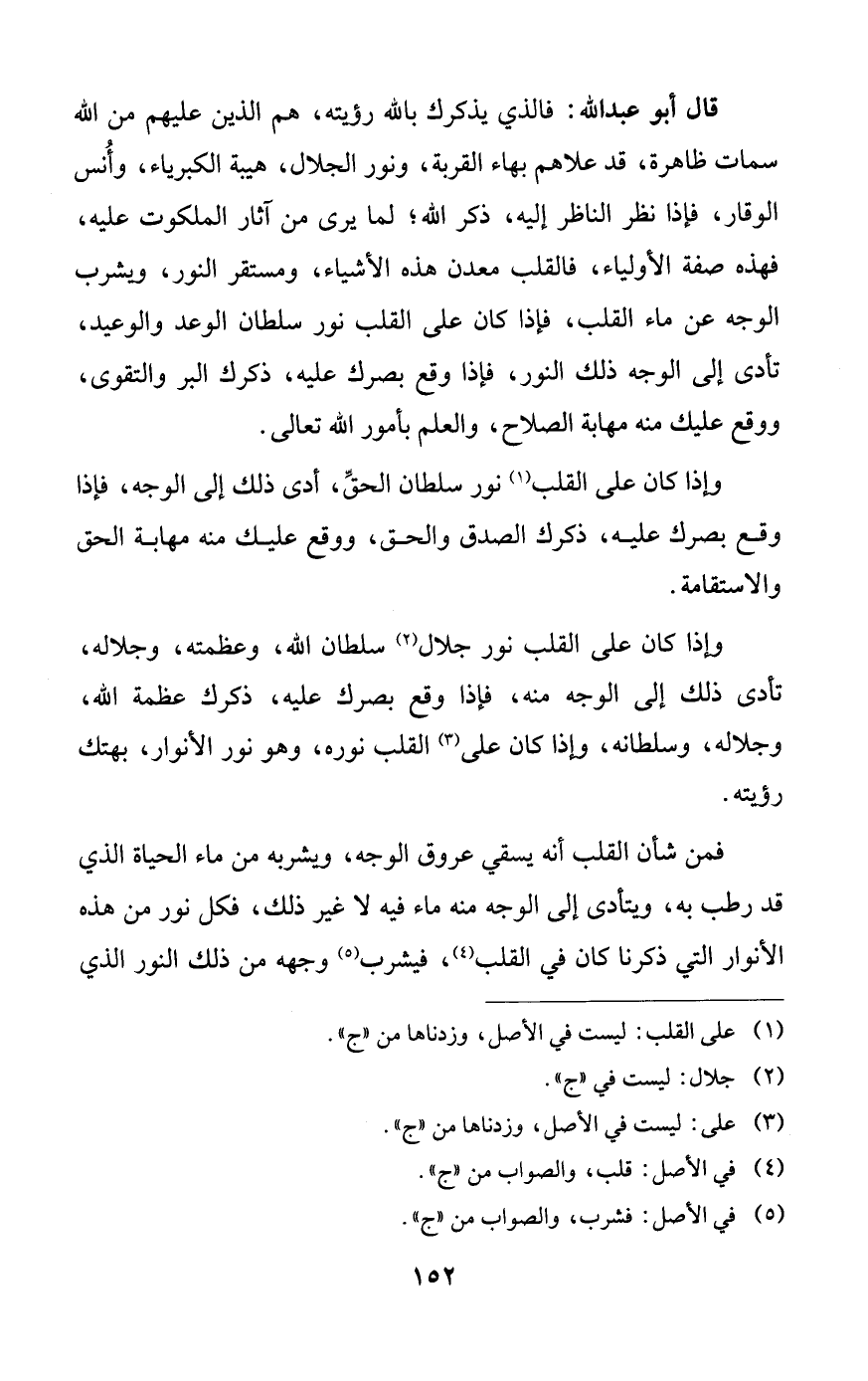 قال أبو عبد الله: فالذي يذكرك بالله رؤيته، هم الذين عليهم من الله سمات ظاهرة، قد علاهم بهاء القربة، ونور الجلال، هيبة الكبرياء، وأنس الوقار، فإذا نظر الناظر إليه، ذكر الله؛ لما يرى من آثار الملكوت عليه، فهذه صفة الأولياء، فالقلب معدن هذه الأشياء، ومستقر النور، ويشرب الوجه عن ماء القلب، فإذا كان على القلب نور سلطان الوعد والوعيد، تأدى إلى الوجه ذلك النور، فإذا وقع بصرك عليه، ذكرك البر والتقوى، ووقع عليك منه مهابة الصلاح، والعلم بأمور الله تعالى.