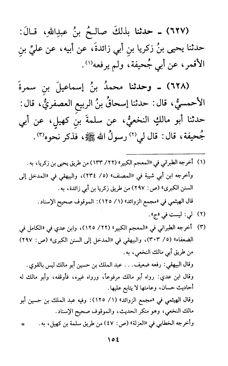 627 - حدثنا بذلك صالح بن عبد الله، قال: حدثنا يحيى بن زكريا ابن أبي زائدة، عن أبيه، عن عليٍّ بن الأقمر، عن أبي جحيفة، ولم يرفعه.