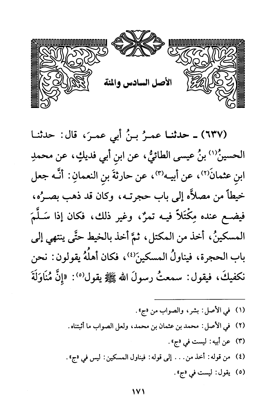 637 - حدثنا عمر بن أبي عمر، قال: حدثنا الحسين بن عيسى الطائي، عن ابن أبي فديكٍ، عن محمد ابن عثمان عن أبيه، عن حارثة بن النعمان: أنه جعل خيطاً من مصلاه إلى باب حجرته، وكان قد ذهب بصره، فيضع عنده مكتلاً فيه تمرٌ، وغير ذلك، فكان إذا سلم المسكين، أخذ من المكتل، ثم أخذ بالخيط حتى ينتهي إلى باب الحجرة، فيناول المسكين، فكان أهله يقولون: نحن نكفيك، فيقول: سمعت رسول الله صلى الله عليه وسلم يقول: ((إن مناولة