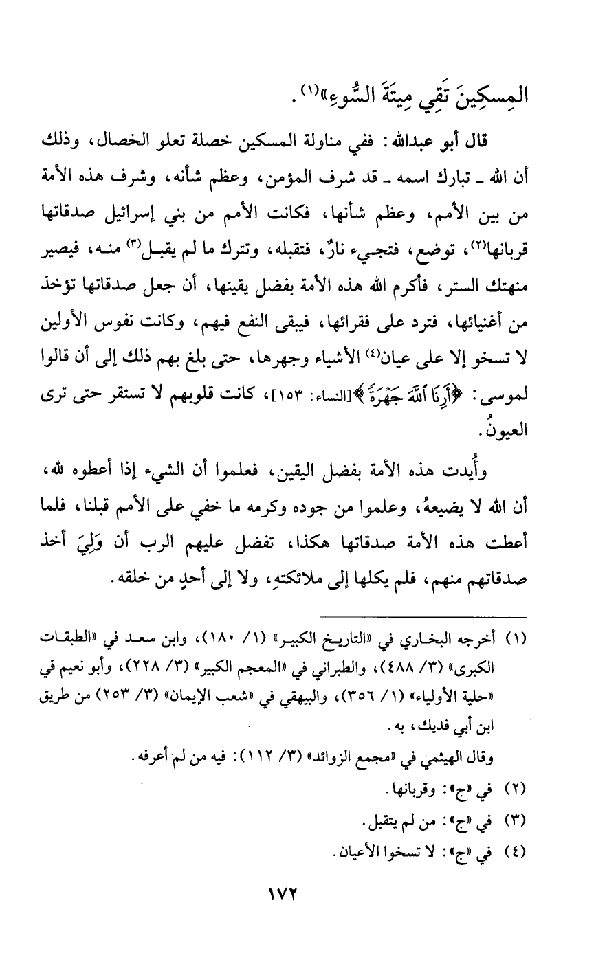 قال أبو عبد الله: ففي مناولة المسكين خصلة تعلو الخصال، وذلك أن الله -تبارك اسمه- قد شرف المؤمن، وعظم شأنه، وشرف هذه الأمة من بين الأمم، وعظم شأنها، فكانت الأمم من بني إسرائيل صدقاتها قربانها، توضع، فتجيء نارٌ، فتقبله، وتترك ما لم يقبل منه، فيصير منهتك الستر، فأكرم الله هذه الأمة بفضل يقينها، أن جعل صدقاتها تؤخذ من أغنيائها، فترد على فقرائها، فيبقى النفع فيهم، وكانت نفوس الأولين لا تسخو إلا على عيان الأشياء وجهرها، حتى بلغ بهم ذلك إلى أن قالوا لموسى: {أرنا الله جهرةً}، كانت قلوبهم لا تستقر حتى ترى العيون.