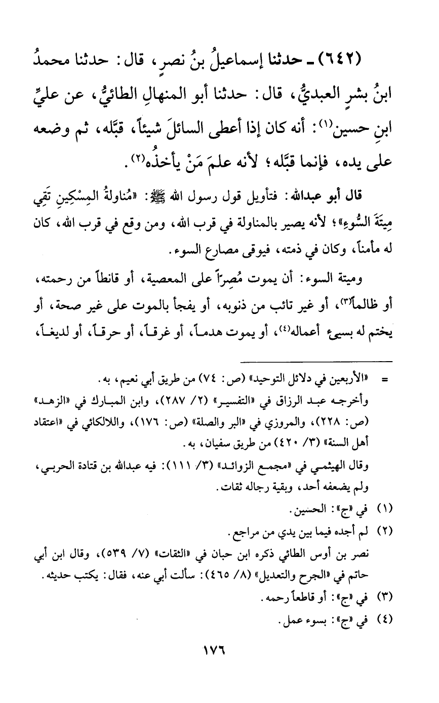 642 - حدثنا إسماعيل بن نصرٍ، قال: حدثنا محمد ابن بشرٍ العبدي، قال: حدثنا أبو المنهال الطائي، عن علي ابن حسين: أنه كان إذا أعطى السائل شيئاً، قبله، ثم وضعه على يديه، فإنما قبله؛ لأنه علم من يأخذه.