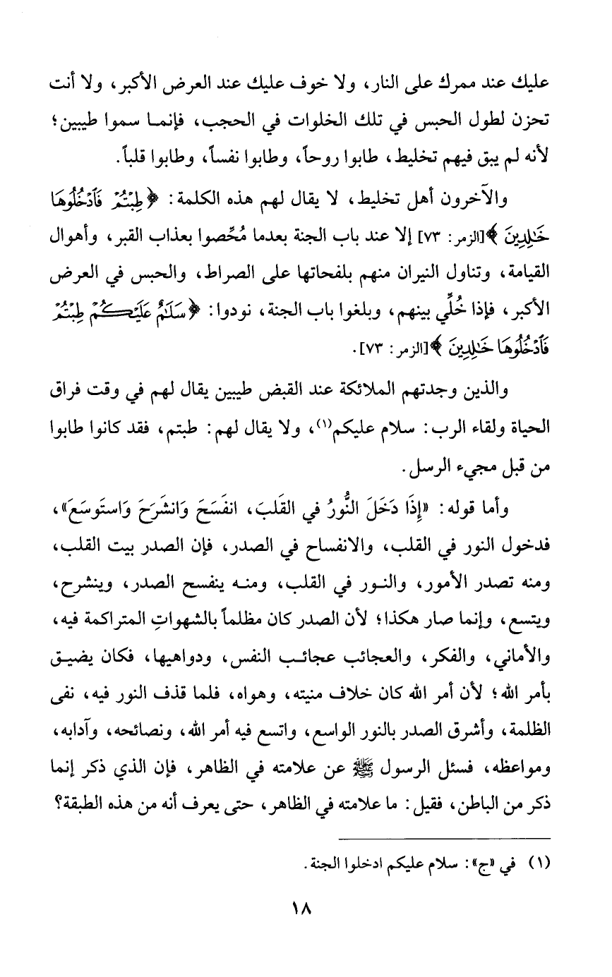 عليك عند ممرك على النار، ولا خوف عليك عند العرض الأكبر، ولا أنت تحزن لطول الحبس في تلك الخلوات في الحجب، فإنما سموا طيبين؛ لأنهم لم يبق فيهم تخليط، طابوا روحاً، وطابوا نفساً، وطابوا قلباً.