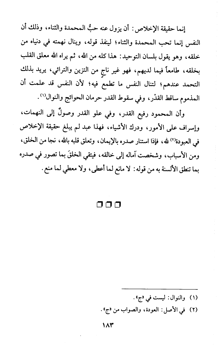 وأن المحمود رفيع القدر، وفي علو القدر وصولٌ إلى النهمات، وإسراف على الأمور، ودرك الأشياء، فهذا عبد لم يبلغ حقيقة الإخلاص في العبودة لله، فإذا استنار صدره بالإيمان، وتعلق قلبه بالله، نجا من الخلق، ومن الأسباب، وشخصت آماله إلى خالقه، فيتقي الخلق بما تصور في صدره بما تنطق الألسنة به من قوله: لا مانع لما أعطى، ولا معطي لما منع.
