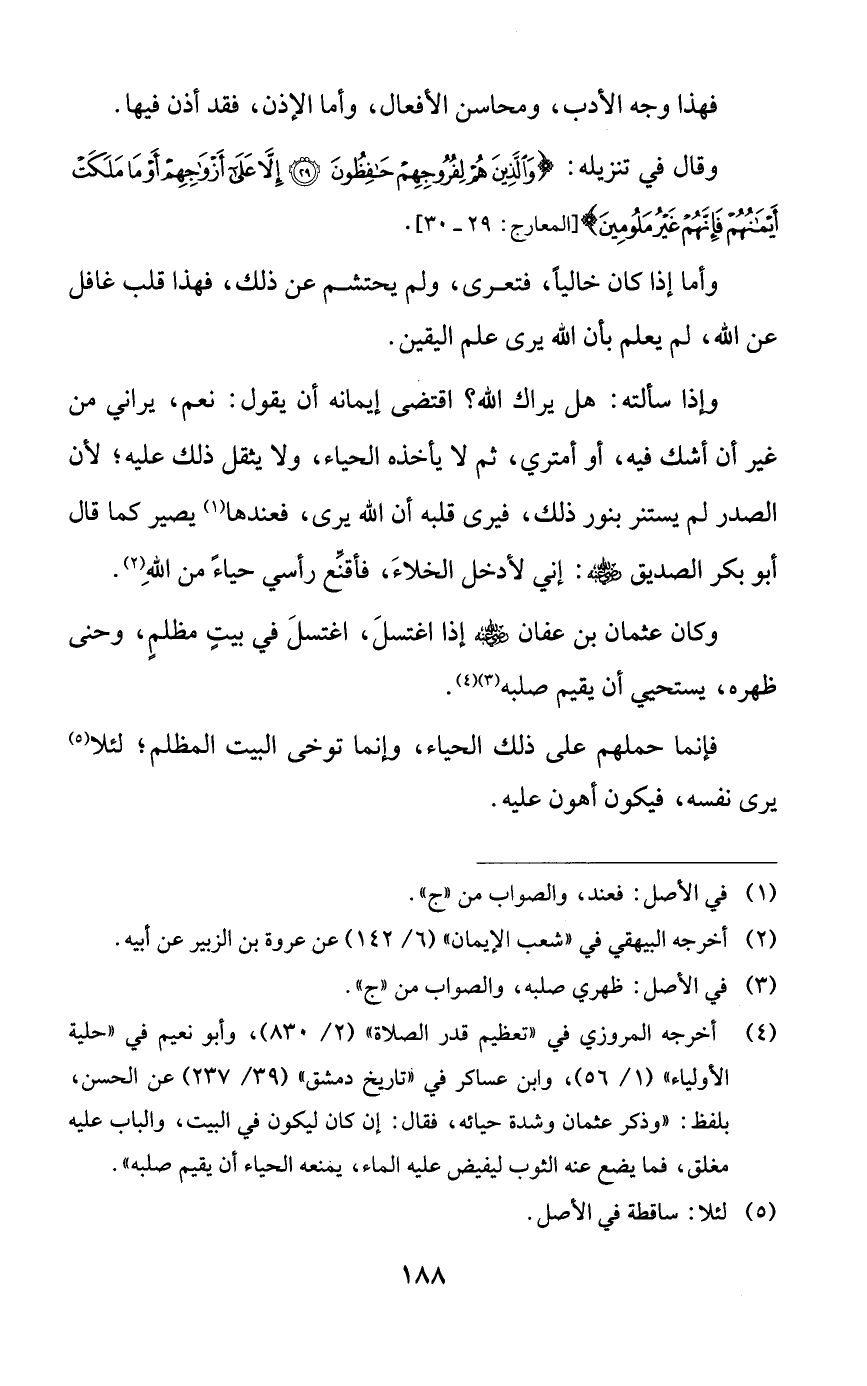 وإذا سألته: هل يراك الله؟ اقتضى إيمانه أن يقول: نعم، يراني من غير أن أشك فيه، أو أمتري، ثم لا يأخذه الحياء، ولا يثقل ذلك عليه؛ لأن الصدر لم يستنر بنور ذلك، فيرى قلبه أن الله يرى، فعندها يصير كما قال أبو بكر الصديق رضي الله عنه: إني لأدخل الخلاء، فأقنع رأسي حياءً من الله.