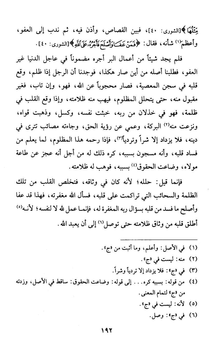 فلم يجد شيئًا من أعمال البر أجره مضموناً في عاجل الدنيا غير العفو، فطلبنا أصله من أين صار هكذا، فوجدنا أن الرجل إذا ظلم، وقع قلبه في سجن المعصية، فصار محجوباً عن الله، فهو، وإن تاب، فغير مقبول منه، حتى يتحلل المظلوم، فيهب منه ظلامته، وإذا وقع القلب في ظلمة، فهو في خذلان من ربه، خبثت نفسه، وكسل، وذهبت قواه، ونزعت منه البركة، وعمي عن رؤية الحق، وجاءته مصائب تترى في دينه، فلا يزداد إلا شراً وتردياً، فإذا رحمه هذا المظلوم، لما يعلم من فساد قلبه، وأنه مسجون بسببه، كره ذلك له من أجل أنه عجز عن طاعة مولاه، وضاعت الحقوق بسببه، فوهب له ظلامته.
