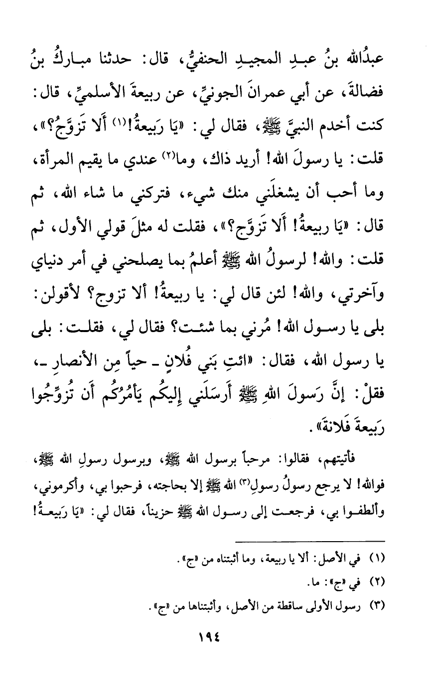 عبد الله بن عبد المجيد الحنفي، قال: حدثنا مبارك بن فضالة، عن أبي عمران الجوني، عن ربيعة الأسلمي، قال: كنت أخدم النبي صلى الله عليه وسلم، فقال لي: ((يا ربيعة! ألا تزوج؟))، قلت: يا رسول الله! أريد ذاك، وما عندي ما يقيم المرأة، وما أحب أن يشغلني منك شيء، فتركني ما شاء الله، ثم قال: ((يا ربيعة! ألا تزوج؟))، فقلت له مثل قولي الأول، ثم قلت: والله! لرسول الله صلى الله عليه وسلم أعلم بما يصلحني في أمر دنياي وآخرتي، والله! لئن قال لي: يا ربيعة! ألا تزوج؟ لأقولن: بلى يا رسول الله! مرني بما شئت؟ فقال لي: فقلت: بلى يا رسول الله، فقال: ((ائت بني فلانٍ -حياً من الأنصار-، فقل: إن رسول الله صلى الله عليه وسلم أرسلني إليكم يأمركم أن تزوجوا ربيعة فلانة)).