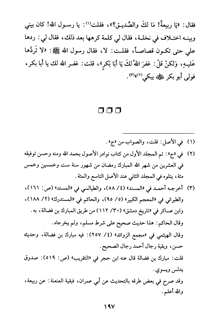فقال: ((يا ربيعة! ما لك والصديق؟))، فقلت: يا رسول الله! كان بيني وبينه اختلاف في نخلة، فقال لي كلمة كرهها بعد ذلك، فقال لي: ردها علي حتى تكون قصاصاً، فقلت: لا، فقال رسول الله صلى الله عليه وسلم: ((لا تردها عليه، ولكن قل: غفر الله لك يا أبا بكرٍ))، قلت: غفر الله لك يا أبا بكر، فولى أبو بكر رضي الله عنه يبكي)).
