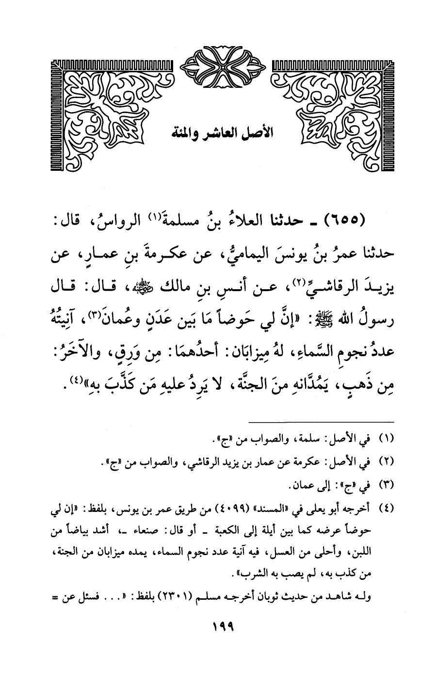 655 - حدثنا العلاء بن مسلمة الرواس، قال: حدثنا عمر بن يونس اليمامي، عن عكرمة بن عمارٍ، عن يزيد الرقاشي، عن أنس بن مالك رضي الله عنه، قال: قال رسول الله صلى الله عليه وسلم: ((إن لي حوضاً ما بين عدنٍ وعمان، آنيته عدد نجوم السماء، له ميزبان: أحدهما: من ورقٍ، والآخر: من ذهبٍ، يمدانه من الجنة، لا يرد عليه من كذب به)).