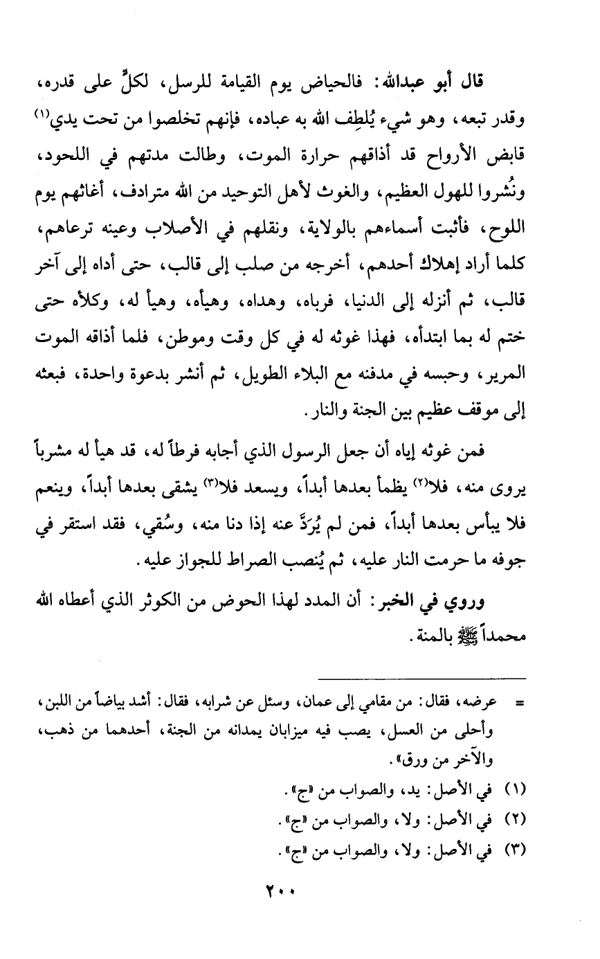 قال أبو عبد الله: فالحياض يوم القيامة للرسل، لكلٍّ على قدره، وقدر تبعه، وهو شيء يلطف الله به عباده، فإنهم تخلصوا من تحت يدي قابض الأرواح قد أذاقهم حرارة الموت، وطالت مدتهم في اللحود، ونشروا للهول العظيم، والغوث لأهل التوحيد من الله مترادف، أغاثهم يوم اللوح، فأثبت أسماءهم بالولاية، ونقلهم في الأصلاب وعينه ترعاهم، كلما أراد إهلاك أحدهم، أخرجه من صلب إلى قالب، حتى أداه إلى آخر قالب، ثم أنزله إلى الدنيا، فرباه، وهداه، وهيأه، وهيأ له، وكلأه حتى ختم له بما ابتدأه، فهذا غوثه له في كل وقت وموطن، فلما أذاقه الموت المرير، وحبسه في مدفنه مع البلاء الطويل، ثم أنشر بدعوة واحدة، فبعثه إلى موقف عظيم بين الجنة والنار.