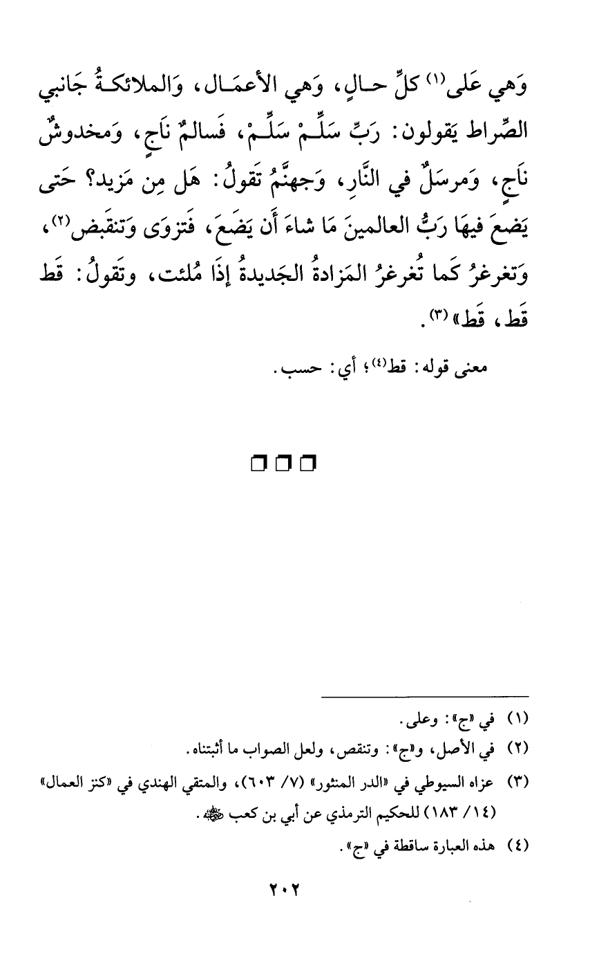 وهي على كل حالٍ، وهي الأعمال، والملائكة جانبي الصراط يقولون: رب سلم سلم، فسالمٌ ناجٍ، ومخدوشٌ ناجٍ، ومرسلٌ في النار، وجهنم تقول: هل من مزيد؟ حتى يضع فيها رب العالمين ما شاء أن يضع، فتزوى وتنقبض، وتغرغر كما تغرغر المزادة الجديدة إذا ملئت، وتقول: قط قط، قط)).