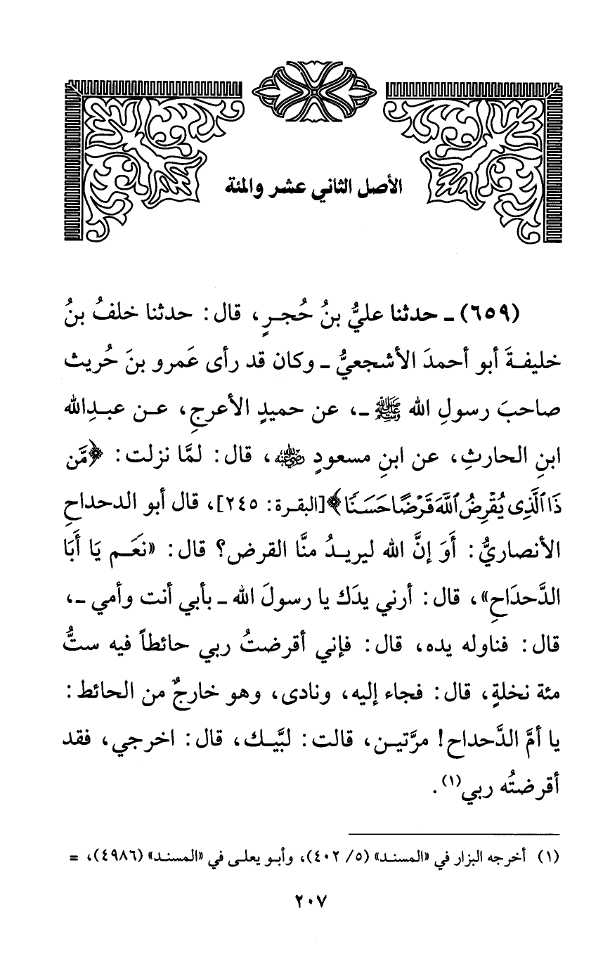 659 - حدثنا علي بن حجرٍ، قال: حدثنا خلف بن خليفة أبو أحمد الأشجعي -وكان قد رأى عمرو بن حريث صاحب رسول الله صلى الله عليه وسلم-، عن حميدٍ الأعرج، عن عبد الله ابن الحارث، عن ابن مسعودٍ رضي الله عنه، قال: لما نزلت: {من ذا الذي يقرض الله قرضاً حسناً}، قال أبو الدحداح الأنصاري: أو إن الله ليريد منا القرض؟ قال: ((نعم يا أبا الدحداح))، قال: أرني يدك يا رسول الله -بأبي أنت وأمي-، قال: فناوله يده، قال: فإن أقرضت ربي حائطاً فيه ست مئة نخلةٍ، قال: فجاء إليه، ونادى، وهو خارجٌ من الحائط: يا أم الدحداح! مرتين، قالت: لبيك، قال: اخرجي، فقد أقرضته ربي.